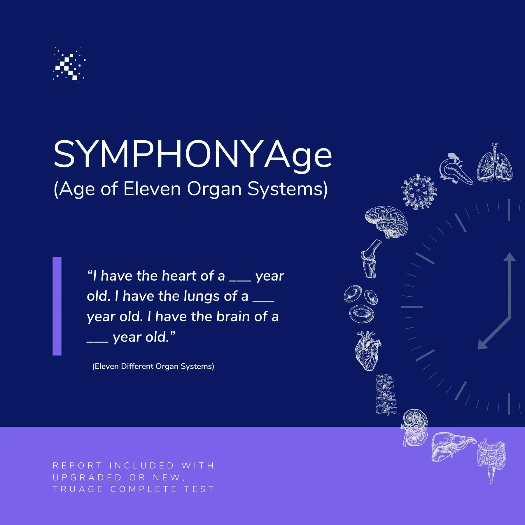 SYMPHONYAge (System Methylation Proxy of Heterogeneous Organ Years), this collection of system-specific clocks provides a new way of looking at aging by examining how different parts of the body decline independently, and synchronously, over time. Due to lifestyle and dietary choices, researchers explain that organ systems age differently in a single body, and that disease-related risks can be calculated by examining 11 major systems and their biological effect on one another. This includes: Lung Age, Heart Age, Brain Age, Hormone Age, Metabolic Age, Musculoskeletal Age, Blood Age, Liver Age, Inflammation Age, Kidney Age, and Immune System Age.